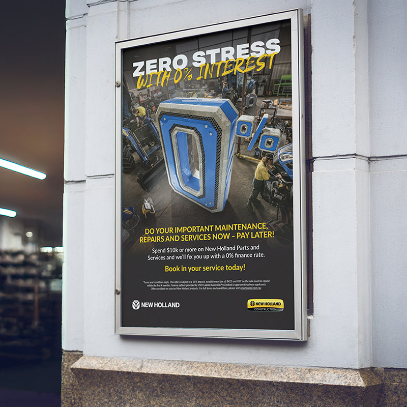 We worked with New Holland Agriculture to bring their Zero Stress, 0% Interest campaign to life, starting with a bold creative concept developed during a collaborative workshop.